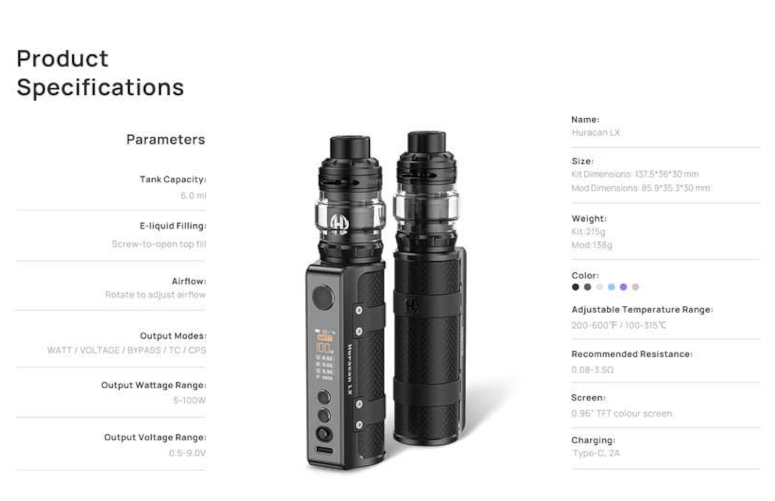 Aspire propose le kit Huracan LX, une cigarette électronique Sub ohm dotée d’une batterie intégrée de 3000mAh et capable de délivrer jusqu’à 100W. Ce modèle compact de 137,5x36x30mm dispose d’un écran TFT 0,96" avec cinq modes de fonctionnement : Watt, Voltage, ByPass, CPS et TC.