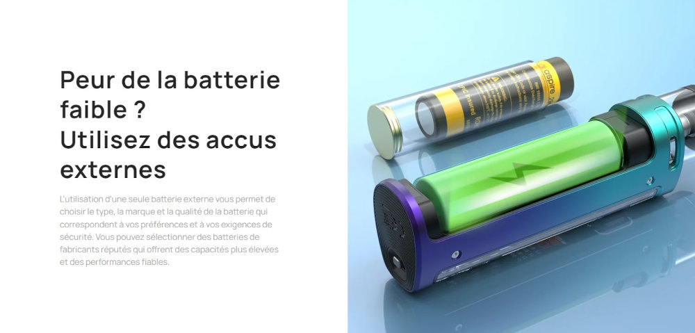 Les accus vous permettent de ne jamais être à court de batterie car il vous suffit de remplacer votre accumulateur épuisé par un accumulateur en pleine charge pour repartir pour des heures de vape. L'emplacement à accu se situe derrière la box et il suffit d'ôter la porte magnétique pour changer votre accumulateur en quelques secondes.