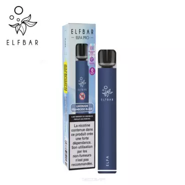 Le kit Elfa Pro Limonade Framboise Bleue d’Elfbar comprend une e-cig complète avec batterie rechargeable de 500mAh et une cartouche pré-remplie de 2ml aux sels de nicotine, aromatisée à la limonade et à la framboise bleue. Cette puff permet l’inhalation d'e-liquide avec nicotine sans réglage.