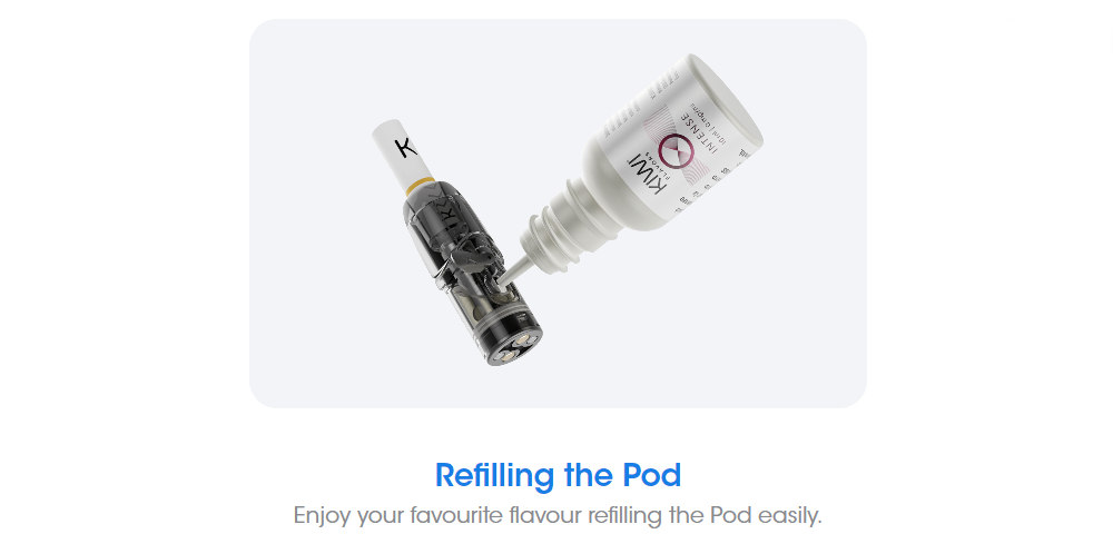 La vape pen Kiwi de la marque italienne Kiwi Vapor est un dispositif compact et pratique pour les amateurs puff. Avec une hauteur de 110 mm et une largeur de 21 mm, elle est facile à transporter et à utiliser partout où vous allez. La contenance de la cartouche pod est de 1,7 ml, une réserve suffisamment importante pour vapoter toute la journée tranquillement. La Kiwi est équipée d'une batterie de 400mAh dans le pod que vous pourrez recharger via le port usb-c et le câble fourni dans le kit. La puissance maximale de 13W pour une expérience de vape en inhalation indirecte douce et agréable. Le remplissage de la cartouche pod se fait sur le côté pour plus de commodité.