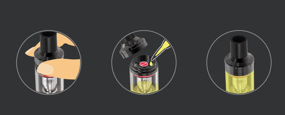 Le top cap dévissable du tank Cosmo vous permet d'accéder au réservoir 2ml. Remplissez votre réservoir via les deux petites rigoles latérale (le trou au centre est dédié à la cheminée et ne doit pas contenir d'eliquide). Remplissez votre réservoir avec la pipette généralement intégrée à votre fiole eliquide.
